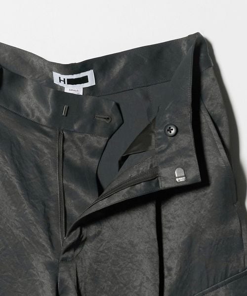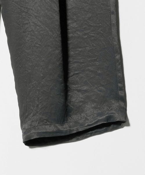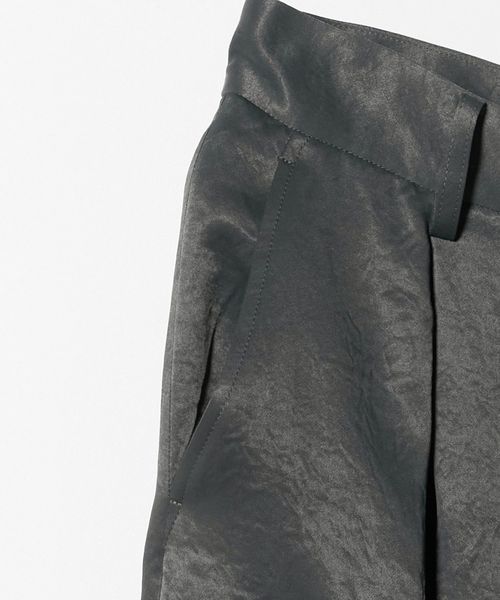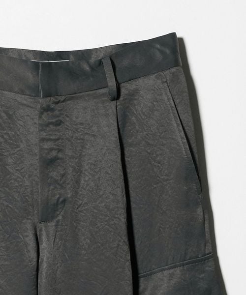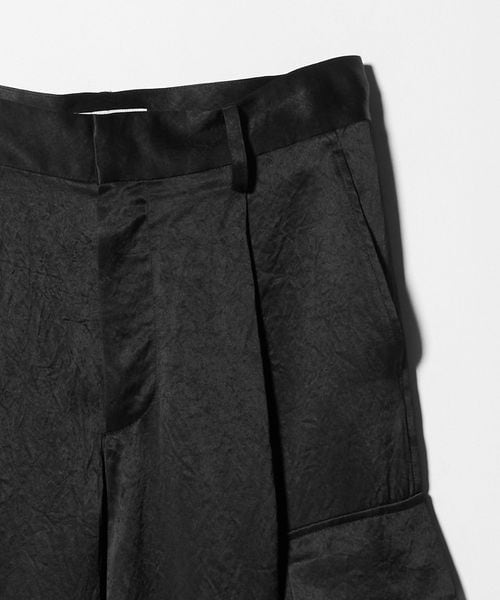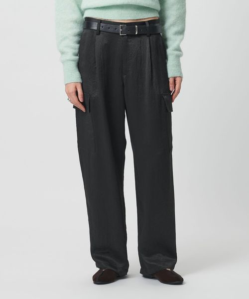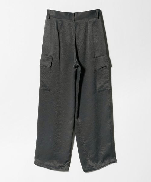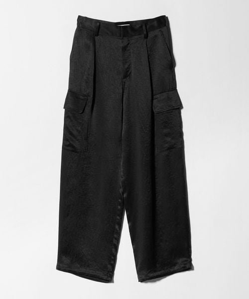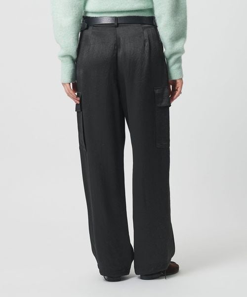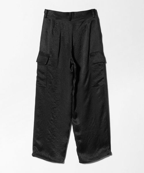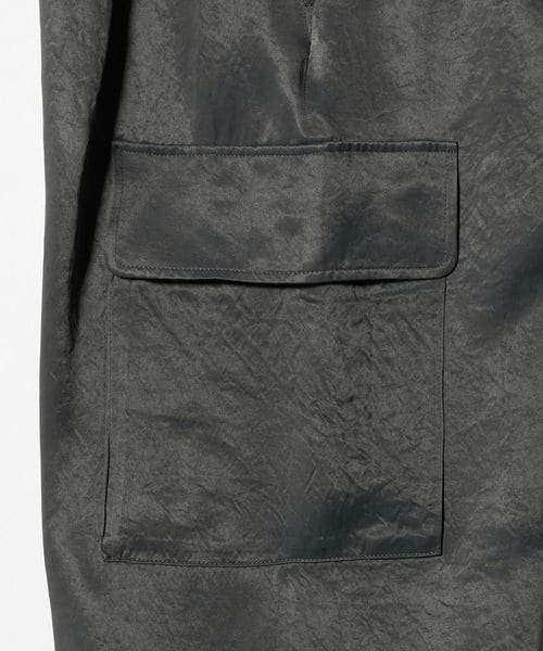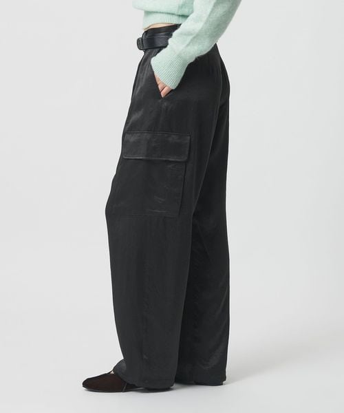 落ち感のある風合いが上品なリラックスムードを運ぶサテンミリタリーパンツです。フロントタックで動きを持たせながら、贅沢なボリュームと艶感が活きる華やかな表情が魅力です。シンプルなパッチポケットが主張感をおさえ、肩肘張らない大人のカジュアルコーディネートを演出。裾のドローストで絞りを加えることで、シルエットのアレンジも楽しめます。オーディナリーなTシャツやスウェット合わせなど、何気ない装いも洗練されたスタイルに導くおすすめの一着。