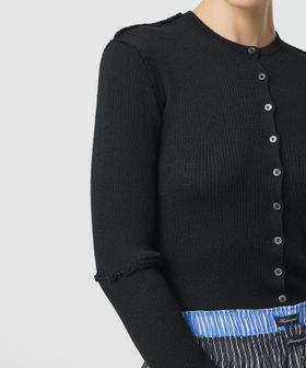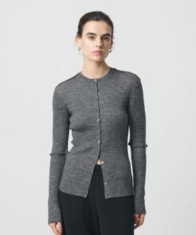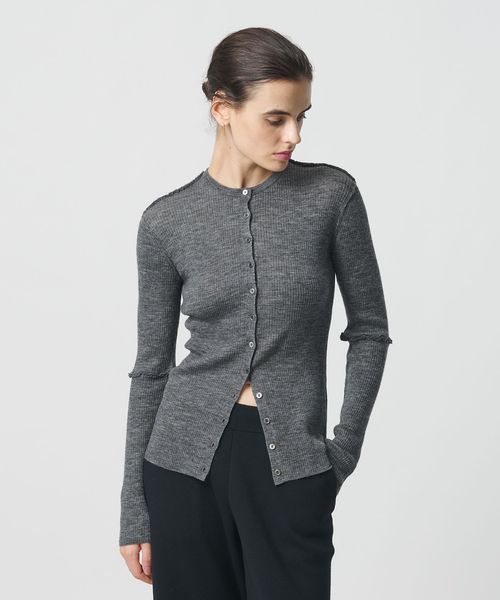 肩と袖の切替をアウトシーム&フリルで飾り付けた、タイトシルエットのリブカーディガンです。ポリエステル×アルパカの細番手紡毛糸を使用した、薄手ながら毛足のある風合いが特徴です。ボディに沿うフィット感がフェミニティを漂わせ、奥行のあるディテール、多めに配した釦が視覚的なデザイン性を生むスパイスに。やや長めのレングスがニュアンスを与え、ボトムス次第でウエストインでもアウトでも様になります。着映えを叶えながら、羽織兼一枚着として楽しめるカーディガンは、気負わず袖を通せるマルチな一着。