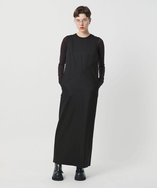 バイアス切り替えでニュアンスを添えたノースリーブワンピースです。適度な張りとさらりとした風合いが魅力の、毛×ポリエステルのツイル生地を使用しています。フロント・バックのアシンメトリーな切り替えに加え、袖口と裾のラフなカットオフディテールが、さりげなくもモダンな表情を演出。洗練されたボクシーなシルエットが、各ディテールを際立たせています。一枚でのミニマルな着こなしや、カーディガンやジャケットを組み合わせたレイヤードスタイルもおすすめです。