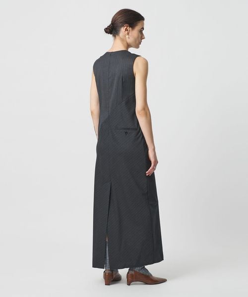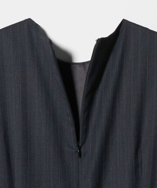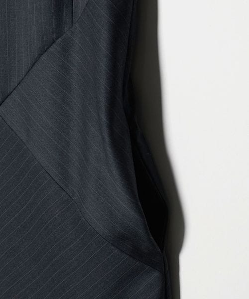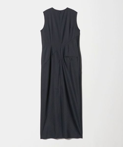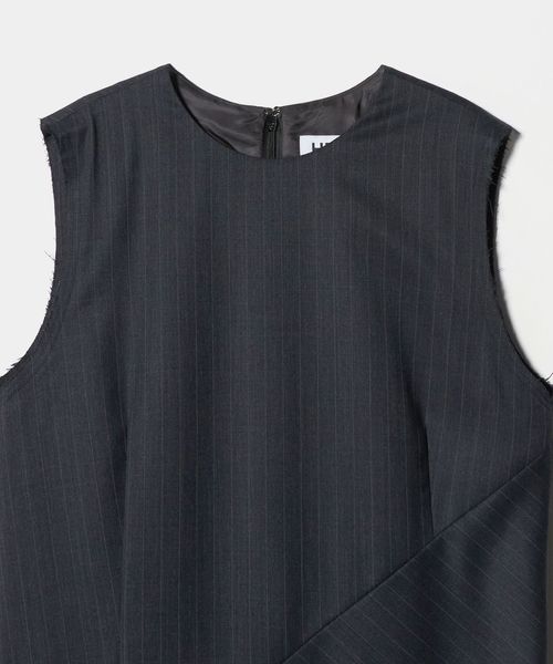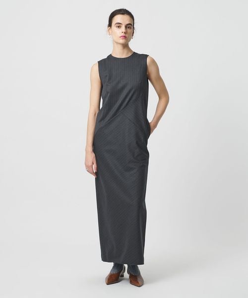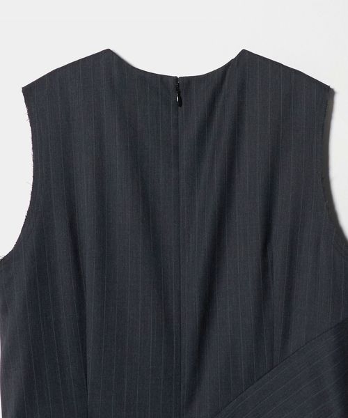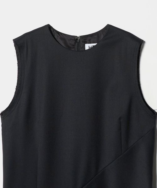バイアス切り替えでニュアンスを添えたノースリーブワンピースです。適度な張りとさらりとした風合いが魅力の、毛×ポリエステルのツイル生地を使用しています。フロント・バックのアシンメトリーな切り替えに加え、袖口と裾のラフなカットオフディテールが、さりげなくもモダンな表情を演出。洗練されたボクシーなシルエットが、各ディテールを際立たせています。一枚でのミニマルな着こなしや、カーディガンやジャケットを組み合わせたレイヤードスタイルもおすすめです。