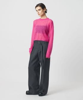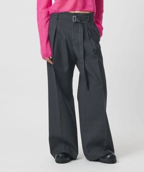 シャープなピンストライプ柄がマニッシュなムードを運ぶ、ハイウエスト型のワイドパンツです。インタックで腰まわりはすっきりとさせ、裾にかけてボリュームを託したリラクシーなシルエットが特徴です。クリアな表面感に仕上げた梳毛の二重織生地を使用し、ほどよいハリ感が存在感を際立たせています。共布ベルトがアクセントを添え、コンパクトなトップス合わせや、ウエストインした着こなしも映えるアイテム。シンプルな装いもアーバンムード漂うクリーンなカジュアルスタイルに導く万能な一着。