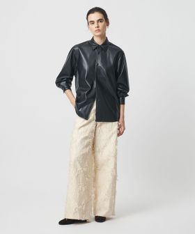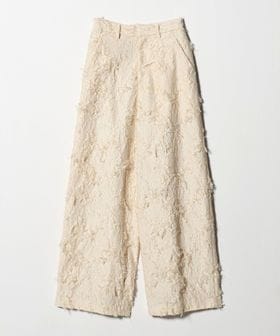 毛足のあるランダムな表情が印象的なワイドパンツです。タテ糸にナイロン、ヨコ糸にコットンとポリエステルを使用したカットジャカードを採用。ノータックのすっきりとした腰回りに、わたりから裾にかけてボリュームを持たせたシルエットが特徴です。シャツ合わせはもちろん、プレーンなTシャツを組み合わせたミニマルな装いもおすすめです。素材の存在感が際立つギミックの利いたデザインが、日常のスタイルに新鮮なギャップをもたらします。