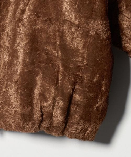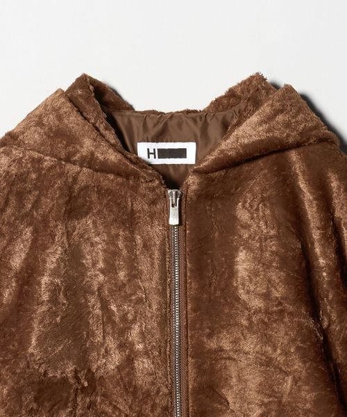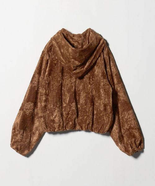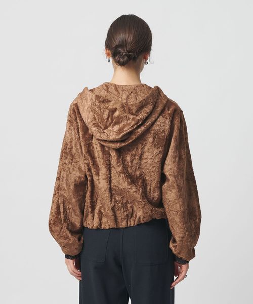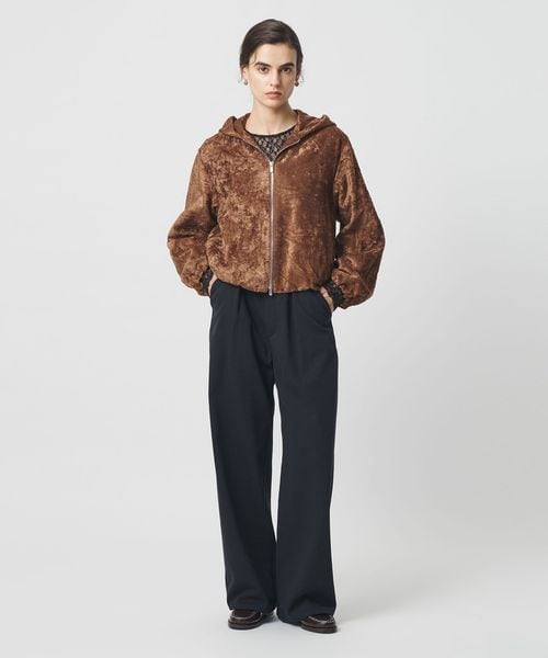 短い毛足に光沢感が特徴のレーヨンシールの生地で仕立てたフードブルゾンです。ラグジュアリーな魅力をまとったスポーティなデザインが、存在感を引き上げます。ワイドな身幅に、すっきりとしたショートレングス、袖と裾をゴムで絞った丸みのある穏やかなシルエットが特徴です。パンツにもスカートにも合わせやすいボディバランスで、アウターとしてはもちろんトップス感覚でも楽しめる一着。素材を活かしたミニマルな佇まいが、秋冬の装いを華やかに彩ります。