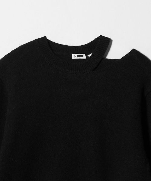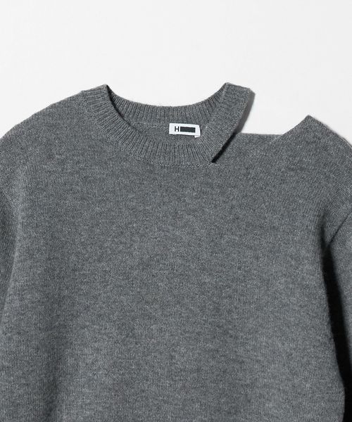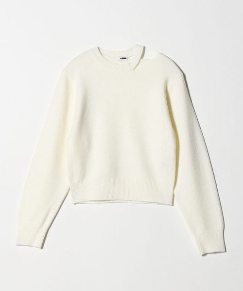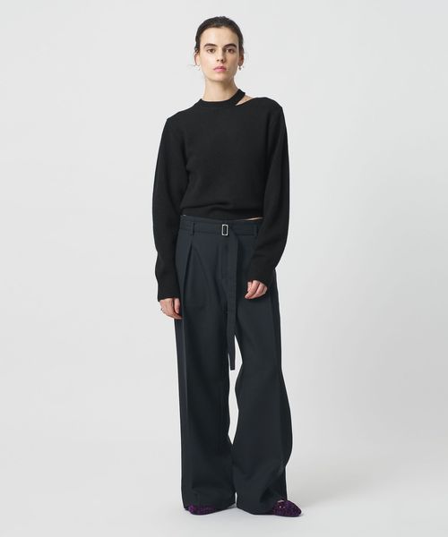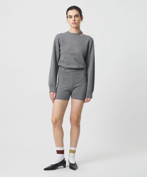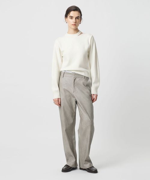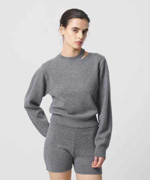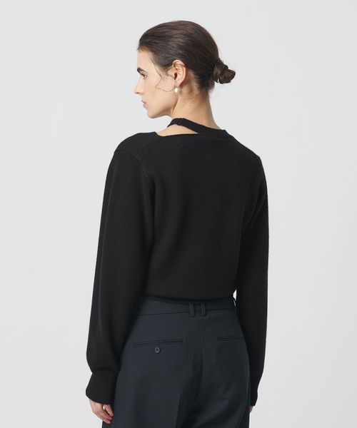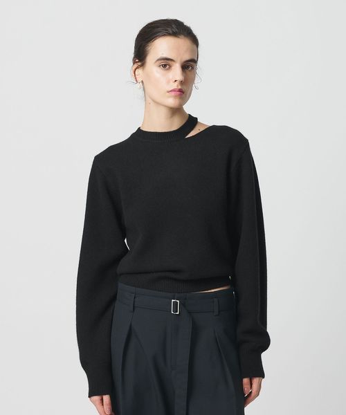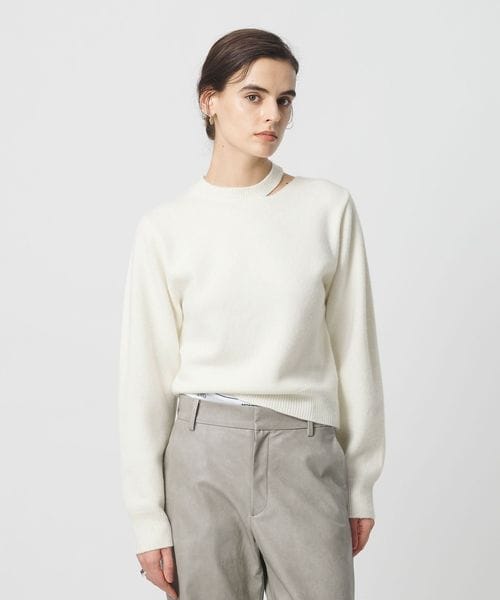 襟元のスリットがエッジーなニュアンスを添えるロングスリーブニットです。リラクシーなワイドシルエットをリブで絞った、丸みのある穏やかなシルエット。表情を加えたアシンメトリーなネックデザインが、シンプルな装いにさりげないアクセントをプラスします。すっきりとしたレングスが、パンツにもスカートにも合わせやすく、トレンドのローウエストボトムとも好相性。ウール×カシミヤのやわらかな風合いが贅沢な気分へと誘いながら、シーズンコーディネートを華やかに彩ります。
