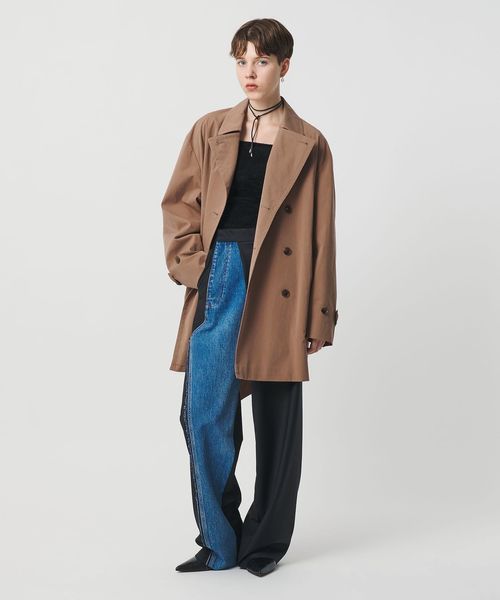 ゆったりとしたサイジングに、ミドルレングスのボディバランスが印象的なトレンチコートです。ヴィンテージ感のある風合いが特徴のツイル生地を使用し、ナイロンの絶妙なハリ感が心地よい一着。ラペルを留めたり、共布ベルトでウエストマークしたりと、アレンジ幅も広く楽しめます。パンツはもちろん、ミニボトムとも相性がよく、ニュアンスを利かせたバレルシルエットがファッションムードを高めてくれる一着。アーバンスタイルに映える存在感で、日常のアウターコーディネートをスタイリッシュに彩ります。