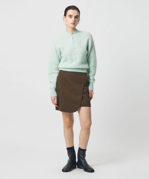 アシンメトリーに重ねたラップ風のデザインが特徴のミニスカートです。生地にハリと反発感を出す加工を施した素材を使用しています。ウエストから腰回り、ヘムラインにもカーブを利かせ、やわらかなラインを描くモダンなデザイン。タイトなトップスを添えたミニマルなスタイルや、ジャケットやブルゾンから覗かせるだけでも印象的なアクセントに。穏やかな空気をまとった美しいフォルムが、大人のフェミニティを昇華します。