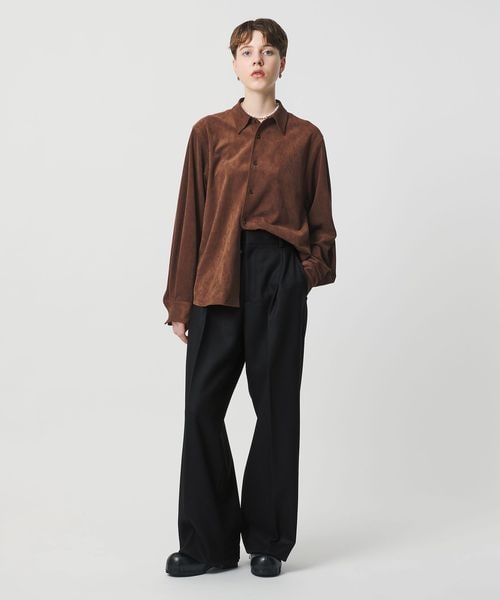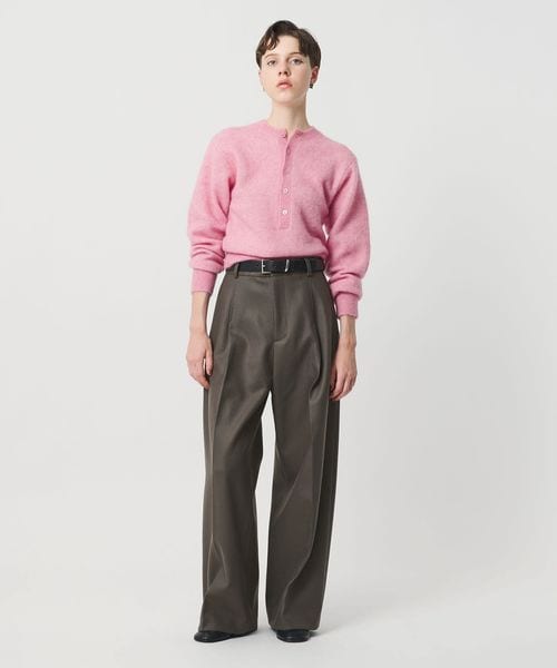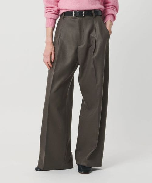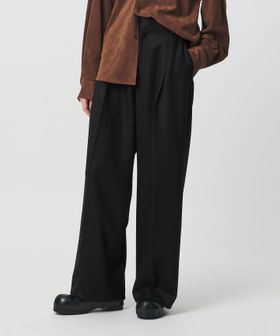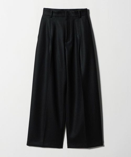 リュクスな重厚感と洗練されたムードが漂う、ウールメルトンのバギーパンツです。細番手のウールを高密度で織り上げたメルトン生地を使用し、二重織の適度な厚みと張り感が特徴です。フロントタックをステッチで押さえることで腰まわりをすっきりとさせ、裾に向かってボリュームを託した贅沢なワイドシルエット。深めの股上にセンタークリースの組み合わせが、品のある大人のスタイルを演出します。ほどよい温もりと艶やかな表情が存在感を引き立て、冬の装いをスタイリッシュに彩ります。