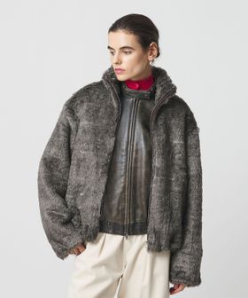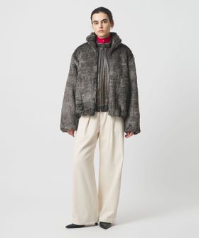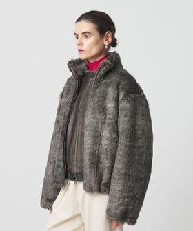 ミンク風のフェイクファーで仕立てたジップブルゾンです。やわらかく上品な毛足が見た目にも華やかなムードを与えてくれます。ピッチを大きめにとったサイズバリエーションで、ほどよいゆとりのSと、オーバーサイズめのMをご用意。パンツにもスカートにも合わせやすいレングスに、ワイドな身幅、裾ゴム仕様でメリハリをつけた、丸みのある穏やかなシルエットが特徴です。低めのスタンドカラーとジップアップのデザインが、無造作に羽織るだけでスマートなアウターコーディネートを演出します。