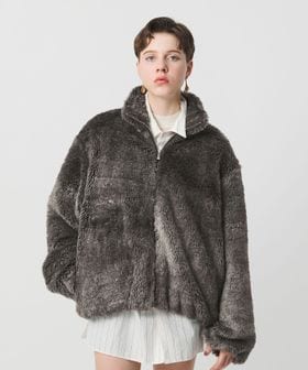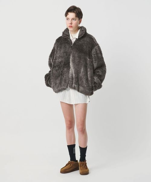 ミンク風のフェイクファーで仕立てたジップブルゾンです。やわらかく上品な毛足が見た目にも華やかなムードを与えてくれます。ピッチを大きめにとったサイズバリエーションで、ほどよいゆとりのSと、オーバーサイズめのMをご用意。パンツにもスカートにも合わせやすいレングスに、ワイドな身幅、裾ゴム仕様でメリハリをつけた、丸みのある穏やかなシルエットが特徴です。低めのスタンドカラーとジップアップのデザインが、無造作に羽織るだけでスマートなアウターコーディネートを演出します。