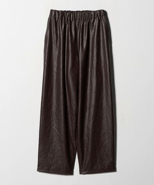 タフな重厚感を持ちあわせたリラクシーな雰囲気が魅力のレザーライクパンツです。光沢感のある表面加工を施したポリエステル素材を使用し、ほどよい厚さと張り感のある風合いが特徴です。たっぷりとしたウエストギャザーに、ゆるめのカーブシルエットが力の抜けた大人のスタイルを演出。穏やかな風合いのニットやコットンシャツなど、質感の異なる組み合わせが様になります。存在感がありながらも、日常に合わせやすいスポーティーなカジュアルフィーリングが、ファッションムードを高めてくれます。