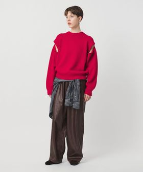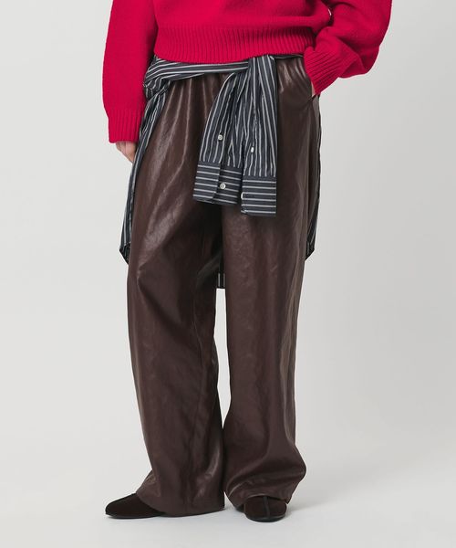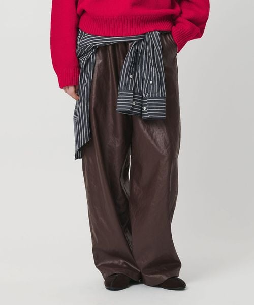 レザーライクのタフな重厚感とリラクシーな雰囲気が魅力のイージーパンツです。光沢感のある表面加工を施したポリエステル素材を使用し、ほどよい厚さと張り感のある風合いが特徴です。たっぷりとしたウエストギャザーに、ゆるめのカーブシルエットが力の抜けた大人のスタイルを演出。穏やかな風合いのニットやコットンシャツなど、質感の異なる組み合わせも映えます。存在感がありながらも、日常に合わせやすいスポーティーなカジュアルフィーリングが、ファッションムードを高めてくれます。