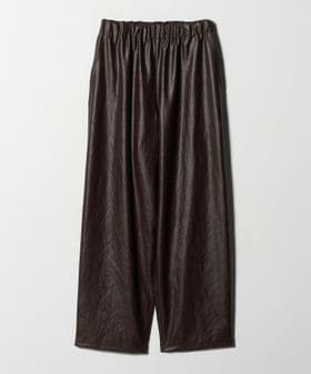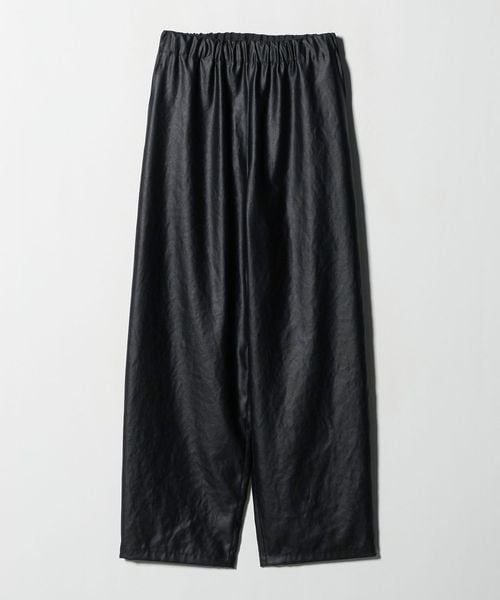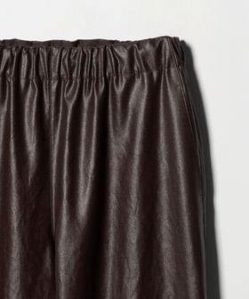 タフな重厚感を持ちあわせたリラクシーな雰囲気が魅力のレザーライクパンツです。光沢感のある表面加工を施したポリエステル素材を使用し、ほどよい厚さと張り感のある風合いが特徴です。たっぷりとしたウエストギャザーに、ゆるめのカーブシルエットが力の抜けた大人のスタイルを演出。穏やかな風合いのニットやコットンシャツなど、質感の異なる組み合わせが様になります。存在感がありながらも、日常に合わせやすいスポーティーなカジュアルフィーリングが、ファッションムードを高めてくれます。
