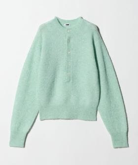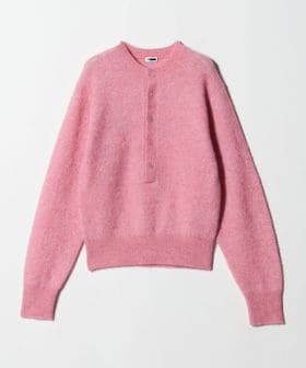 深めのヘンリーネックがポイントのニットプルオーバーです。やわらかく軽さのあるアルパカ混のモッサヤーンで仕立てた、ふんわりとしたタッチが特徴の一着。毛足のある風合いと、ややコンパクトなサイズバランスが愛らしさを引き立て、マニッシュなパンツスタイルやミニスカートとも好相性です。一枚ではもちろん、フロントを開けてシャツや薄手のインナーとのレイヤードも映えるアイテム。エッジが叶うプレイフルなカラーバリエーションと、力の抜けたネックデザインが豊かに調和し、シーズンスタイルを華やかに彩ります。