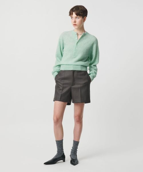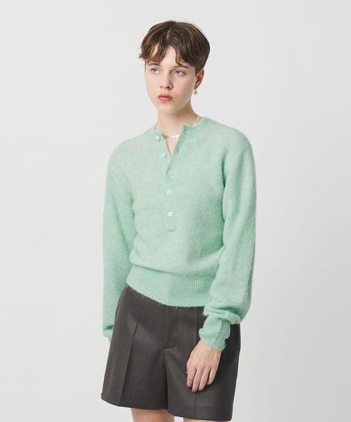 深めのヘンリーネックがポイントのニットプルオーバーです。やわらかく軽さのあるアルパカ混のモッサヤーンで仕立てた、ふんわりとしたタッチが特徴の一着。毛足のある風合いと、ややコンパクトなサイズバランスが愛らしさを引き立て、マニッシュなパンツスタイルやミニスカートとも好相性です。一枚ではもちろん、フロントを開けてシャツや薄手のインナーとのレイヤードも映えるアイテム。エッジが叶うプレイフルなカラーバリエーションと、力の抜けたネックデザインが豊かに調和し、シーズンスタイルを華やかに彩ります。