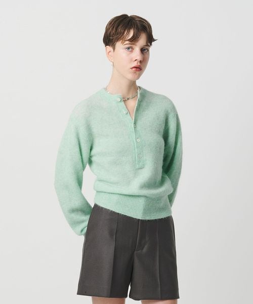 深めのヘンリーネックがポイントのニットプルオーバーです。やわらかく軽さのあるアルパカ混のモッサヤーンで仕立てた、ふんわりとしたタッチが特徴の一着。毛足のある風合いと、ややコンパクトなサイズバランスが愛らしさを引き立て、マニッシュなパンツスタイルやミニスカートとも好相性です。一枚ではもちろん、フロントを開けてシャツや薄手のインナーとのレイヤードも映えるアイテム。エッジが叶うプレイフルなカラーバリエーションと、力の抜けたネックデザインが豊かに調和し、シーズンスタイルを華やかに彩ります。