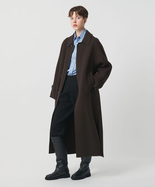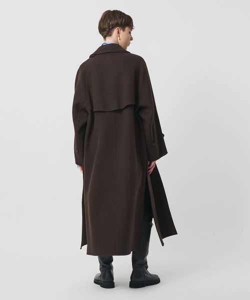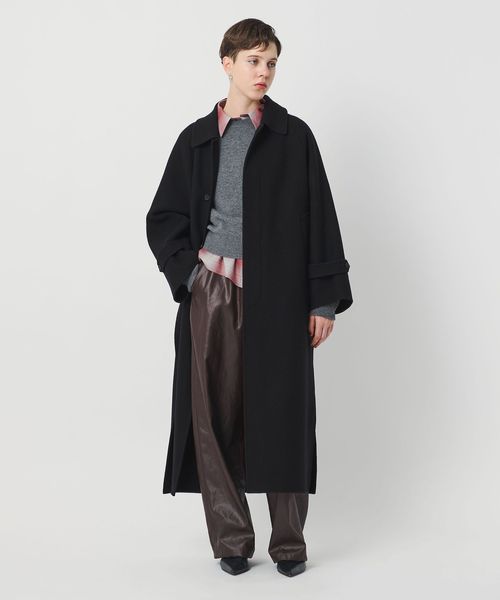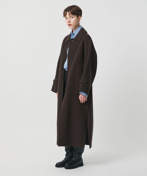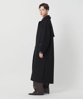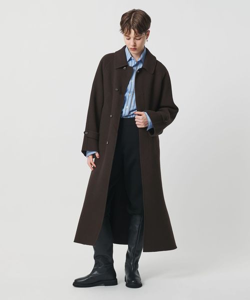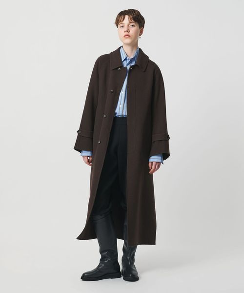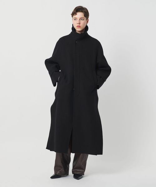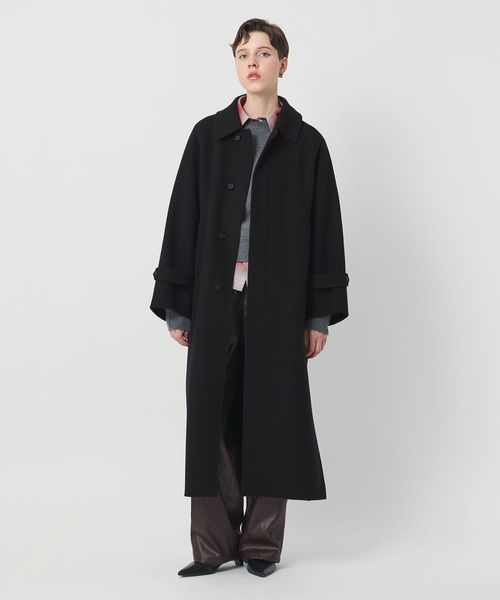 軽やかさと品のあるリラックスムードを携えた、リバー縫製の定番ロングコートです。たっぷりとしたスリーブに、贅沢なレングス設定、腰付近まで開く大胆な両サイドベンツが、着る人を華やかに印象付けます。クラシックなステンカラー型は、無造作に纏うのはもちろん、チンストラップで襟を立てたシャープなスタイルも様になる一着。カジュアルにもモードにも寄り添うミニマルな存在感が、個性を引き立てながら、秋冬のアウターコーディネートを素敵に彩ります。