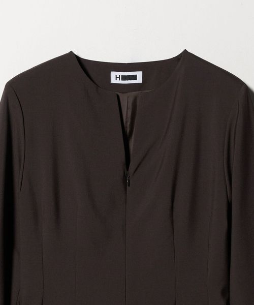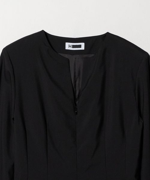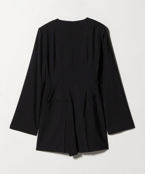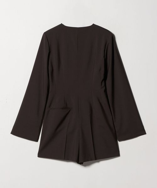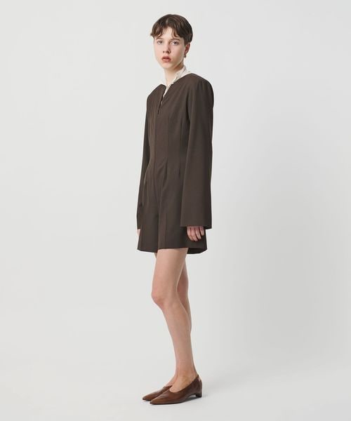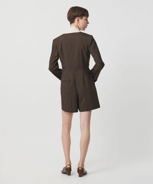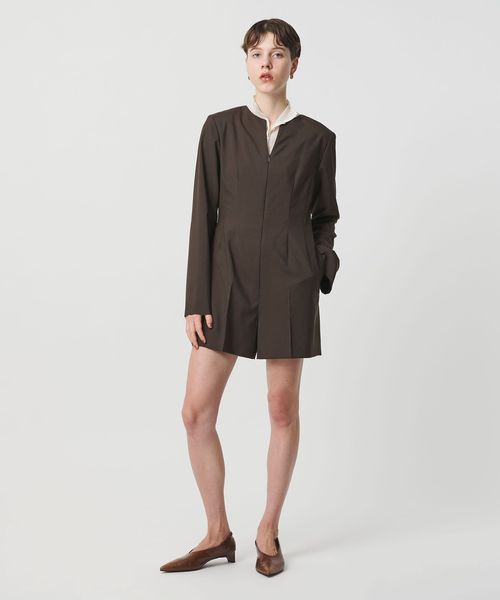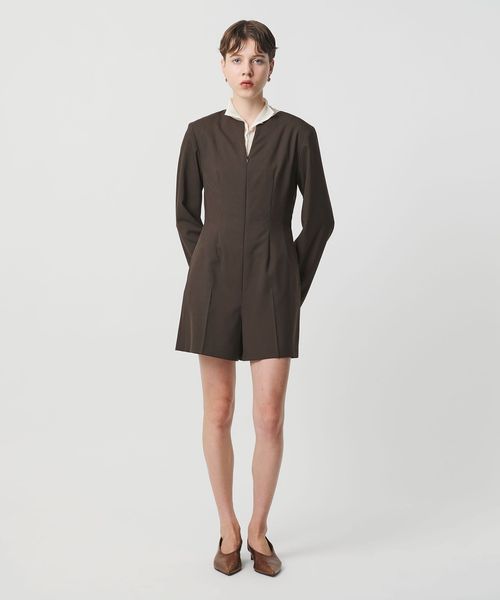 肩パッドでニュアンスをつけた、構築的なシルエットが魅力のオールインワンです。軽快なショートレングスに、ロングスリーブのボディバランスが新鮮な一着。スリットネック、コンシールファスナーのミニマルなフロントに、ダーツでウエストを絞ったフェミニティなデザイン。フォルムにこだわった繊細なディテールが、さりげなくも印象的な装いを叶えます。ポリエステル×毛素材のさらりとした肌触りでレイヤードもしやすく、オールシーズン大活躍。ショート丈アウターとの組み合わせや、ハードなレザーアイテムとも好相性です。オールインワンならではのカジュアルなフィーリングがほどよい抜け感を与え、自由で飾らない大人のアーバンスタイルへと導きます。
