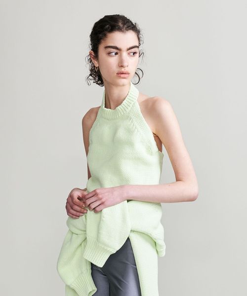 オープンバックが存在感を放つ、ホルターネックニットプルオーバーです。さらりとした肌触りのコットンナイロンを使用し、膨らみのある太番手のリリヤーンで編み立てたリラクシーなデザイン。ざっくりとしたニット編地を引き立てるヘルシーなアイテムバランスが、コーディネートを華やかに印象付けます。同シリーズのカーディガン(対象品番:16281991048)を組み合わせたアンサンブルの着こなしもおすすめです。