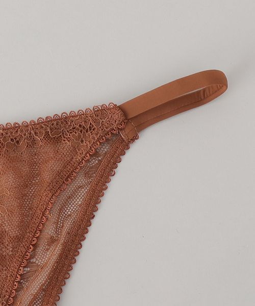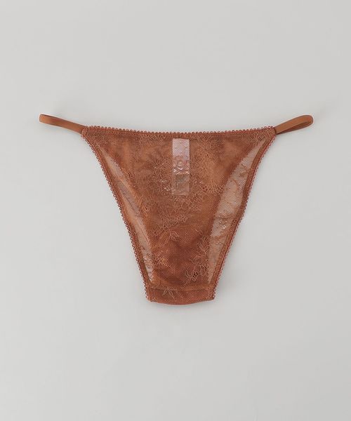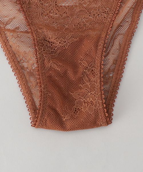 素肌が透けるロマンティックなレースショーツです。ブラウンカラーに彩られた上品なカラーに、華奢なゴムウエストが大人のフェミニティを昇華します。お家でのリラックスタイムから日常まで豊かに寄り添いながら、特別なムードに導くおすすめの一品。