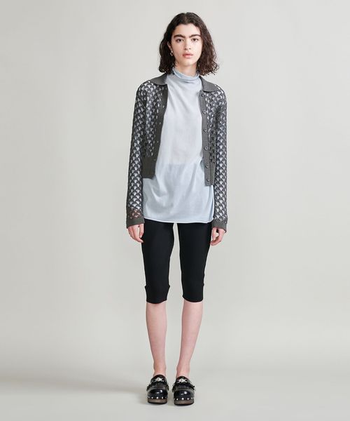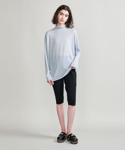 さらりとした風合いと柔らかな落ち感が特徴のシアーニットプルオーバーです。リブ無しで編み立てた袖口・裾のロール状の始末が、肩肘張らないリラックスムードを演出します。透け感を活かしたバンドゥ―インナーとのレイヤードや、シックなジャケットを羽織ってメリハリを楽しむのもおすすめです。センシュアルな魅力を漂わせながら、カジュアルにもモードにも寄り添うデザイン。その絶妙なバランスが、日常のワードローブを華やかに彩ります。