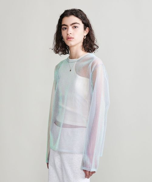 繊細なオーロララメの糸で編み立てたシアーニットプルオーバーです。特徴的な表情を活かしたシンプルなボディデザイン。インナーとのバランスをとり、ややゆとりのあるサイズバランスに設定しました。中に淡色を組み合わせるとやわらかく、濃色を添えるとラメ感が強く出てエッジの効いた表情を楽しめます。シンプルなデザインにセンシュアルな質感を加え、日常の装いを新鮮なスタイルに導きます。