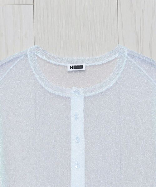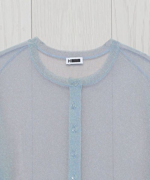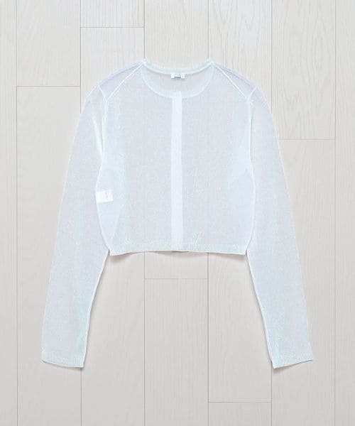 繊細なオーロララメの糸で編み立てたシアーニットカーディガンです。装いにメリハリを生む潔いショート丈、長めにとったスリーブバランスがスタイリッシュな一着。インナーに淡色を組み合わせるとやわらかく、濃色を添えるとラメ感が強く出てエッジの効いた表情を楽しめます。シンプルなデザインにセンシュアルな質感を加え、日常の装いを新鮮なスタイルに導きます。