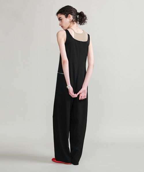大胆に配したサイドファスナーポケットがシャープなアクセントを添えるオールインワンです。上身頃はコンパクトめに設定し、ボトム部分はゆとりをもたせたリラクシーなワイドテーパードシルエット。さらりとしたタッチのトリアセテート/ポリエステルのツイル生地を使用し、ドレープ感のある上品な風合いが装いにクラス感を与えてくれます。日常に溶け込むアイテムデザインに、カジュアル感を押さえたモードなバランスが新鮮なアイテム。シンプルに一枚ではもちろん、シアーインナーやフィット感のあるリブトップスとのレイヤードも映え、合わせ方次第でロングシーズン活躍いただけるおすすめの一着。