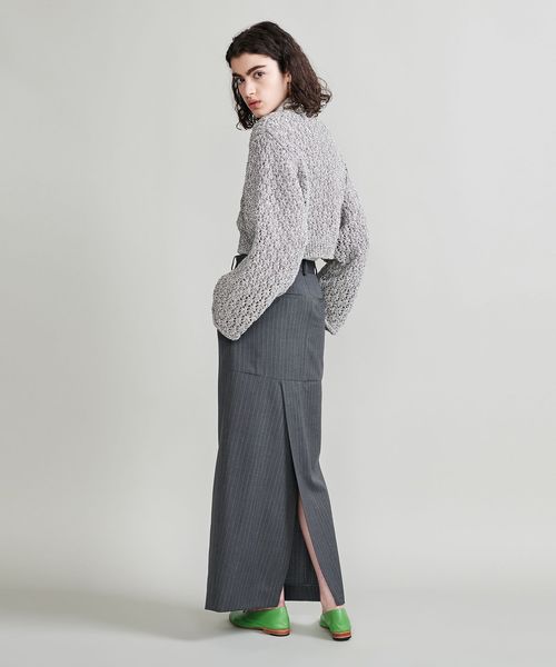 シャープなIラインシルエットが特徴のロングタイトスカートです。薄手でさらりとしたタッチのトロピカル生地を使用しました。印象的なバックスリットは、切替を施しクロスオーバーさせたモダンなデザイン。贅沢なレングスと細身のフォルムは、タックインしたコンパクトな着こなしや、着丈長めのトップスとも好相性です。シンプルながら個性が光るスカートは、カジュアルにもモードにも寄り添うおすすめの一着。