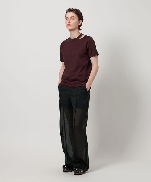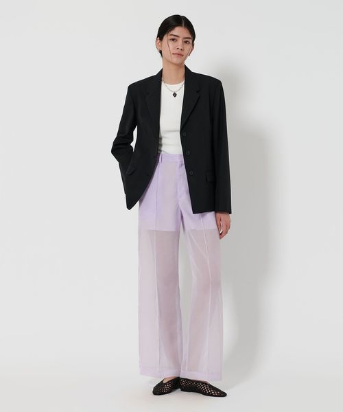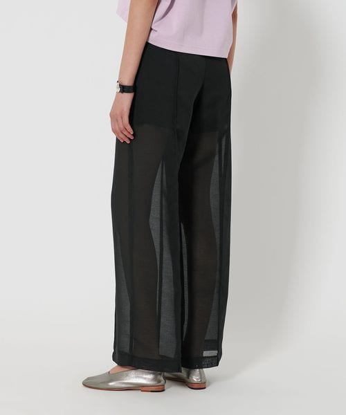 ドライタッチで透け感のあるオーガンジーで仕立てたワイドパンツです。ピンタック使いのハンサムなトラウザー型に、やわらかな抜け感を纏ったセンシュアルな質感が新鮮なバランスを生み出します。オーバーサイズのトップスと組み合わせたり、タイトでヘルシーなタンクトップとも好相性。自由なスタイルを叶えながら、シンプルな装いをモダンに昇華してくれます。