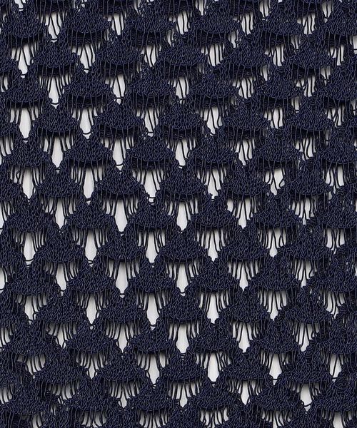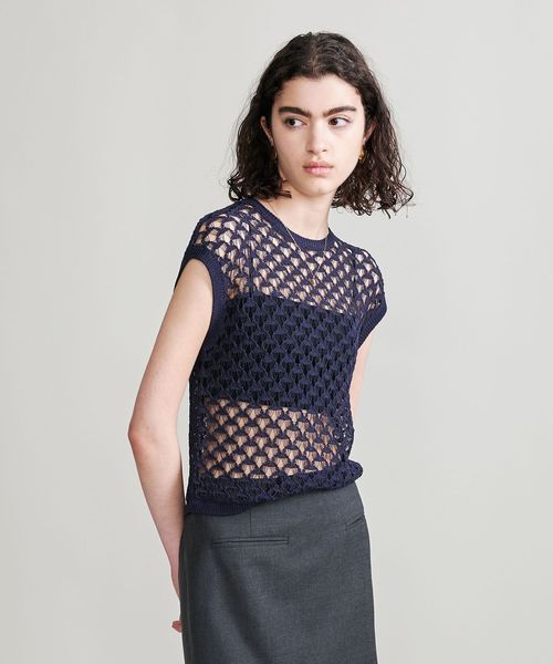 三角モチーフのグラフィカルな模様が特徴の透かし編みニットプルオーバーです。光沢のあるコットン/ナイロンのコードヤーンで仕立てた繊細で涼しげな表情が、春夏の装いを華やかに彩ります。詰まり気味のクルーネック、肩先を覆うノースリーブが、品のあるミニマルな装いを演出。華奢なバンドゥを添えたシンプルな着こなしや、シャツをインナーに組み合わせたベスト風のレイヤードもおすすめです。着映えを叶えながら、合わせ方次第で幅広いスタイルを楽しめる万能な一着。