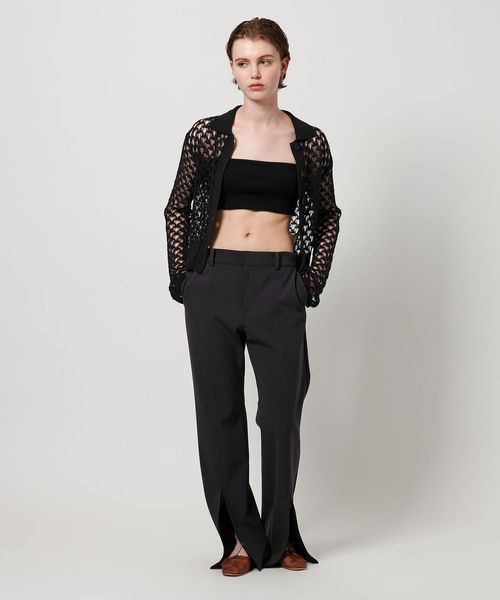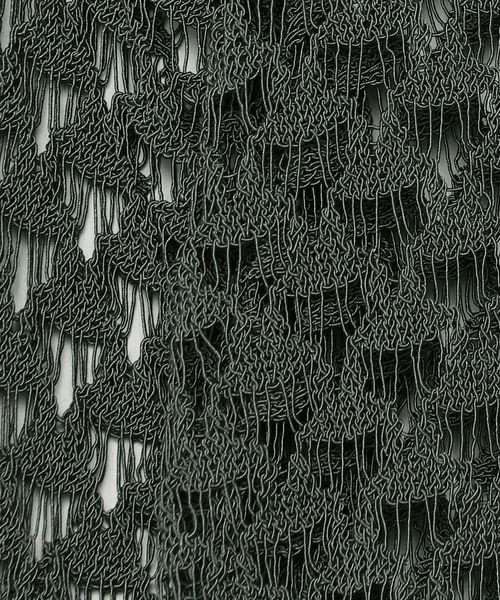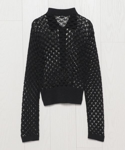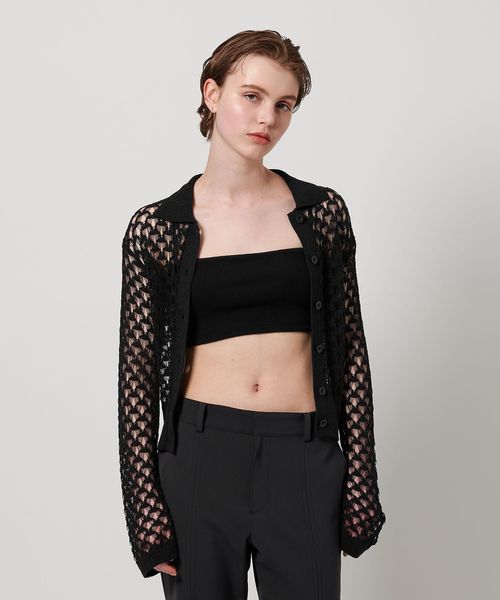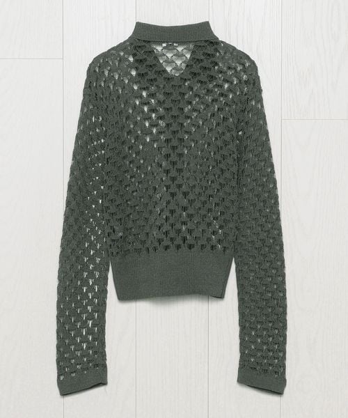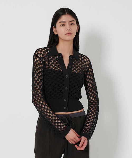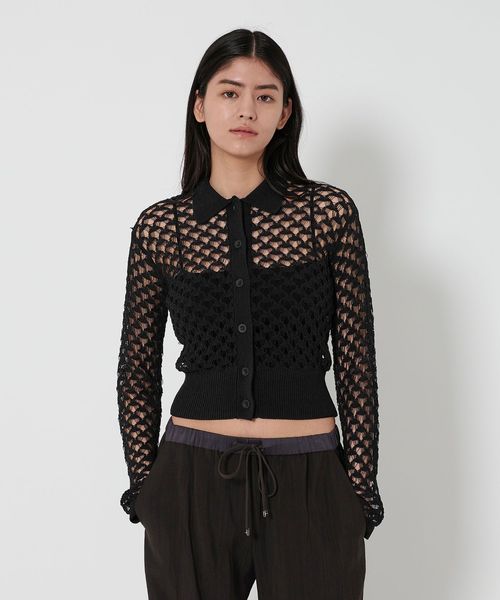 三角モチーフのグラフィカルな模様が特徴の透かし編みカーディガンです。光沢のあるコットン/ナイロンのコードヤーンで仕立てた繊細で涼しげな表情が、春の装いを華やかに彩ります。クラシックな襟付きのデザインに、落ち着いたカラーバランスが、甘さをおさえたモードなスタイルを演出。シルエットは、コンパクトなボディ&長めにとった袖丈で構成し、フェミニティなムードを高めながら一枚着のほか羽織としても活躍します。定番のデニムを添えたり、コンパクトなミニスカートに合わせたミニマルな正統派スタイルもおすすめ。アーバンスタイルに寄り添いながら、コーディネートの主役になるアイコニックな一着。