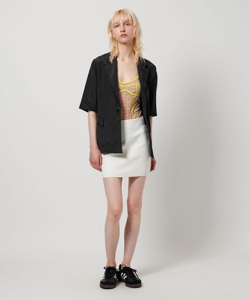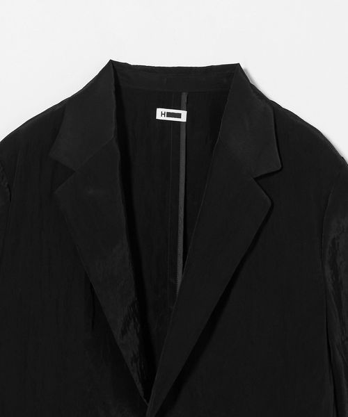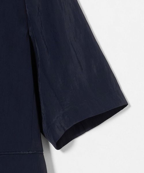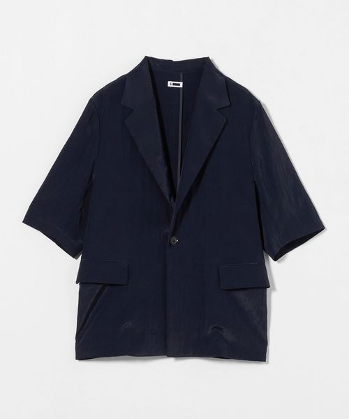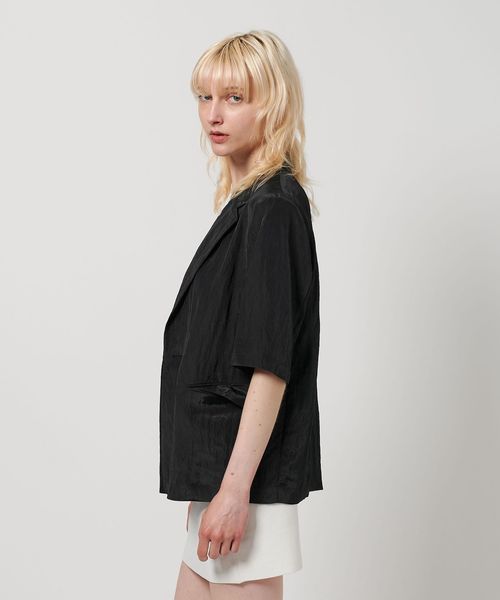 シックで軽快な装いを叶える、ハーフスリーブのテーラードジャケットです。微光沢の風合いに、シワ加工を施したナチュラルな表情が、肩肘張らないリラクシーなムードを演出します。カーディガン感覚で気軽に羽織れる利便性と、ジャケットが持つ端正な魅力が活かされたデザイン。穏やかな季節にマッチした心地よいアーバンスタイルに導くおすすめの一着。