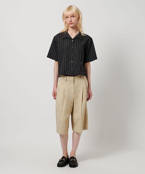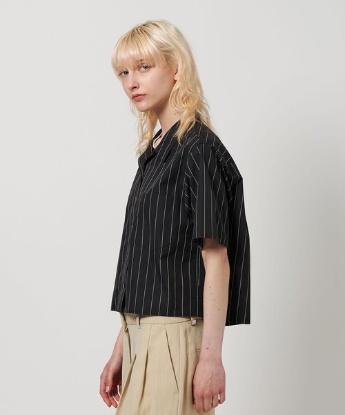 ショート&ワイドなミニマルシルエットが特徴のオープンカラーシャツです。高密度コットンブロードのしなやかな張りに加え、マニッシュなピンストライプ柄が洗練された雰囲気を演出。スクエアカットのヘムラインがトレンドのバランスに導きながら、衿元で抜け感を持たせたリラクシーなデザイン。パンツからスカートまで相性がよく、シンプルな装いをモダンに昇華してくれます。