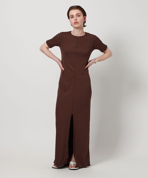 フロントのロングスリットがヘルシーなムードを運ぶ、カットソーワンピースです。裾のメローロックでニュアンスをつけ、スーパーマキシのレングスに仕立てたスタイリッシュなデザイン。適度な厚みで安心感を与えるポリエステルのリブ生地を使用し、ほどよい艶が覗く上品な表面感が大人のカジュアルスタイルを演出します。印象的な着丈を活かしたミニマルコーディネートが様になるアイテム。日常のワードローブに寄り添いながら、クラス感あふれる着こなしに導く万能な一着。