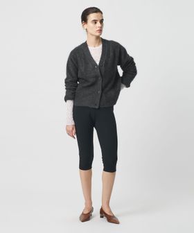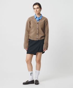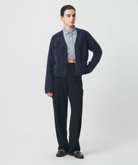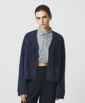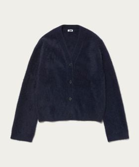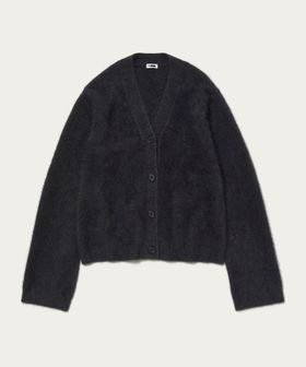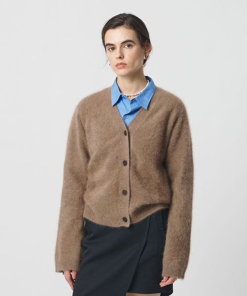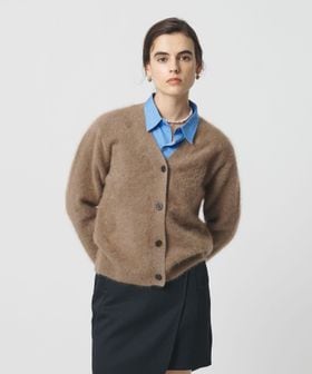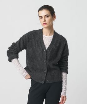 ヘアリーな質感をまとった、チャイニーズラクーンのVネックカーディガンです。ボックスシルエットの身頃に、ストンとした長めのスリーブがさりげないニュアンスを演出。やわらかな風合いと上品な毛足感が贅沢な気分へと誘いながら、見た目にも華やかな印象を与えてくれます。シャツとのレイヤードも映え、パンツやスカートとも相性のよい着丈バランスも魅力。主役から脇役までこなす存在感が着こなしの幅を広げ、シンプルなスタイリングにリュクスなムードを与えます。