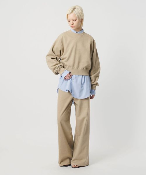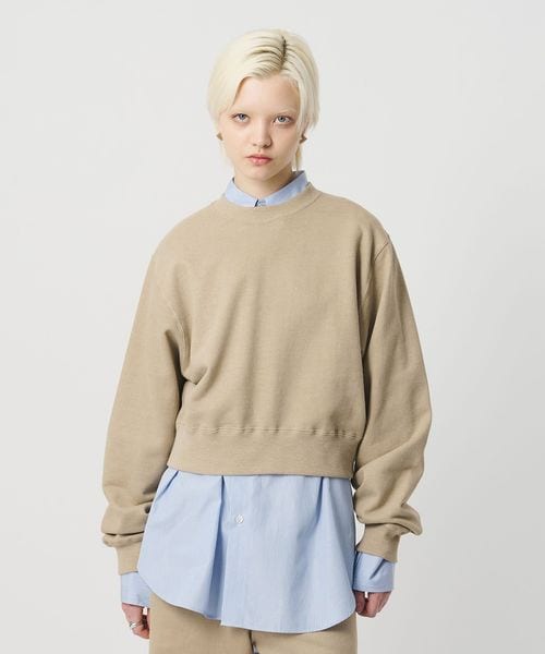 ヴィンテージ風の表情が魅力のスウェットプルオーバーです。両面に顔料染料プリントを施し、何度も洗いをかけてフェード感を出した裏毛を使用しています。すっきりとしたショートレングスに、リラックスムード漂うワイドシルエットが特徴の、メリハリのある穏やかなボディバランス。後下がりのヘムライン、バックネックに施した大きめのガゼットが、シンプルな中にニュアンスを添えます。同シリーズのパンツ(対象品番:16146000016)とのセットアップコーディネートや、シャツ合わせのレイヤードもおすすめです。