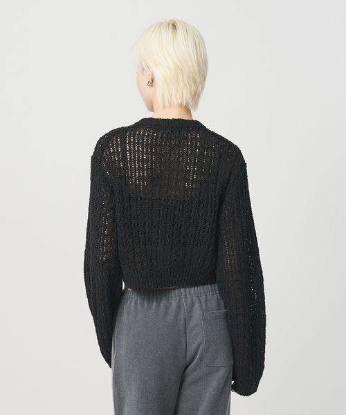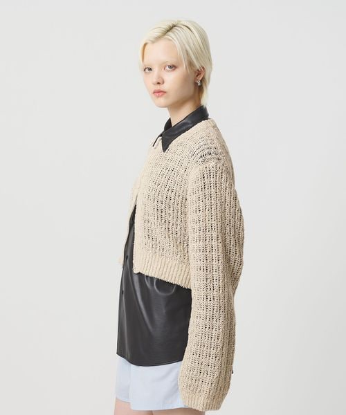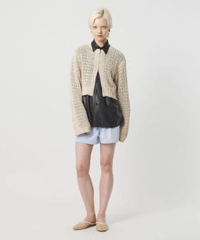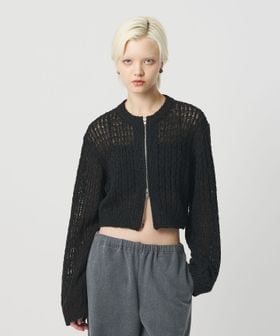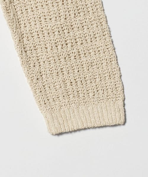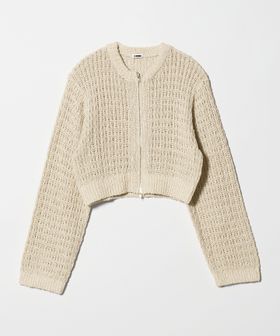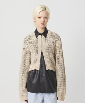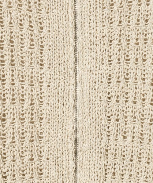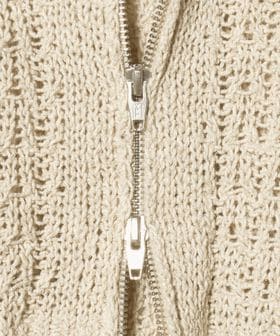 透かし編みの表情がセンシュアルな華やかさを添える、ローゲージカーディガンです。コットン×麻×シルクの太番手糸を使用し、ヴィンテージ感のあるカラーと相まったナチュラルな表情が魅力です。すっきりとしたレングスに、長めのスリーブと太めの袖口が、さりげなくも印象的なスタイルを演出。逆開ファスナーで着こなしのアレンジも効き、羽織兼トップスとして楽しめるカーディガンは、気負わず袖を通せるおすすめの一着。