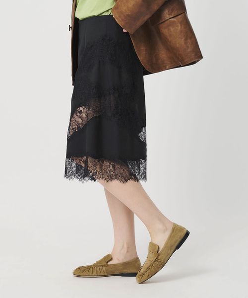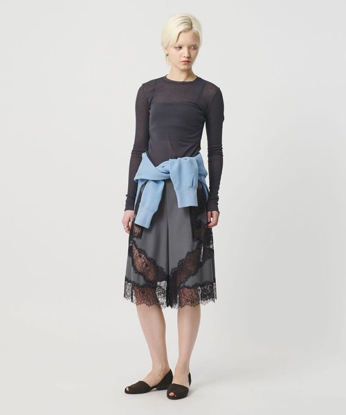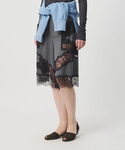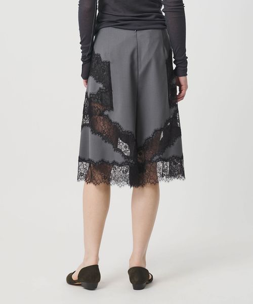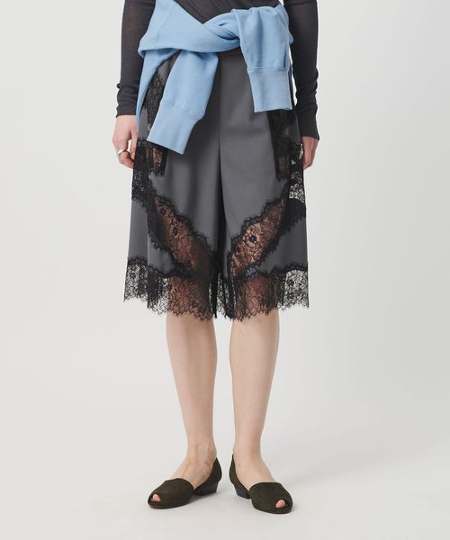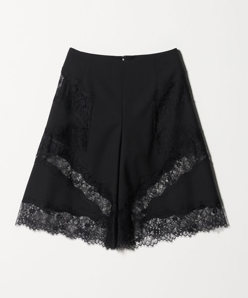 繊細なレースを贅沢にあしらったハーフパンツです。クリアな表面感のトロピカルクロスを使用し、端正な生地に重ねたブラックレースのトリミングが美しい一着。脇まで施したレースが奥行を生み出しながら、ファッションムードを高めてくれます。ボディスーツを合わせたり、大きめのトップスを添えて裾から覗かせた着こなしもおすすめ。甘さをおさえたコンテンポラリーなデザインが洗練された雰囲気をまといながら、日常のスタイルにエッジをプラスします。