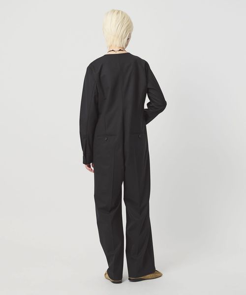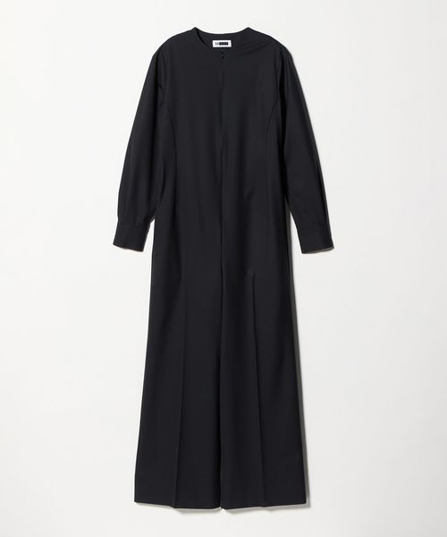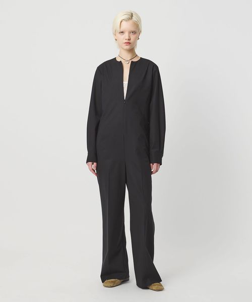 袖口に覗くカフスがクラシックなニュアンスを添える、シンプルなオールインワンです。トリアセテート混のきれいめな素材を使用し、ディテールレスで仕立てたミニマルなバランスが洗練されたスタイルを演出します。ワイドなボトムラインにセンタープレスを効かせ、端正で凛とした雰囲気をプラス。フロントファスナーを開けてスリットネックで抜け感を出したり、インナーレイヤードで奥行を加えた着こなしもおすすめです。