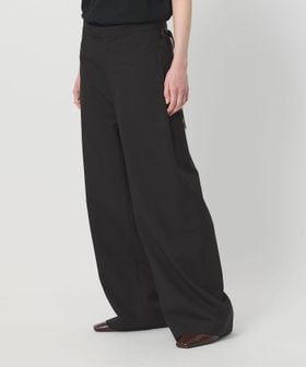 カジュアルデザインと、端正なトロピカルクロスのコンビネーションが新鮮なワイドパンツです。ほどよいボリュームシルエットが存在感を放ちながら、長めに設定したサイドベルトが、さりげないアクセントを添えます。ラフなTシャツやスウェット合わせも決まりやすく、肩肘張らないきれいめなリラックススタイルが楽しめる一着。共地のジャケットとのセットアップコーディネートもおすすめです。