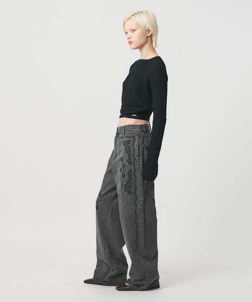 華やかなエンブロイダリーディテールが目を惹くデニムトラウザーズです。13ozデニムを使用し、刺繍の後に加工を施すことで、ナチュラルで奥行のある仕上がりになっています。前後にあしらった刺繍が存在感を高め、愛着を増すスパイスに。ダークトーンに溶け込むシックなDK.GRAYと、レースのような繊細さが薫るCOBALTをご用意しました。
