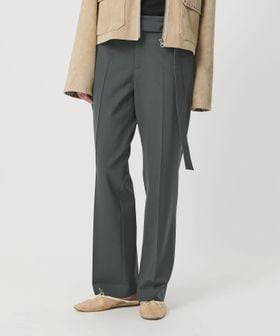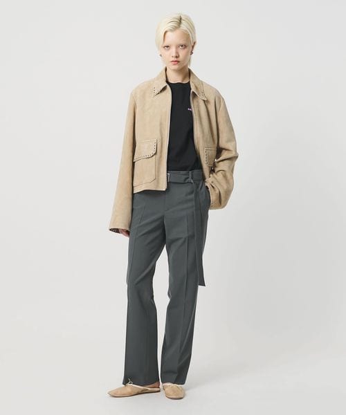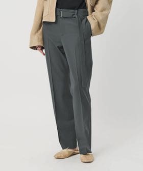 すっきりとしたラインを描く、スリムストレートシルエットのベルト付きトラウザーズです。ドライタッチなトロピカルクロスを使用し、ポリエステル×毛×ポリウレタンをブレンドした、柔らかくしなやかな風合いが魅力です。長めのベルトが抜け感を添え、マニッシュでシャープなローウエストデザインがファッションムードを高めてくれます。お揃いのジャケットとのセットアップや、シンプルなTシャツ合わせもおすすめです。