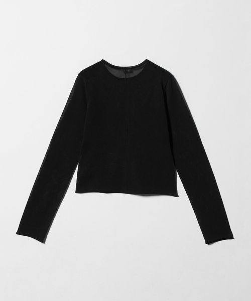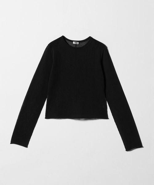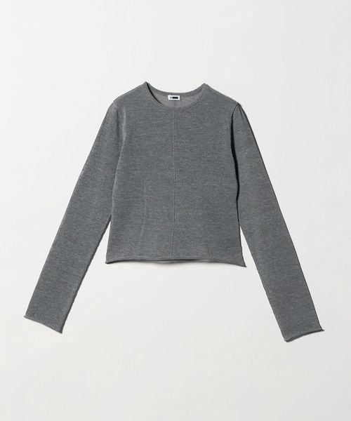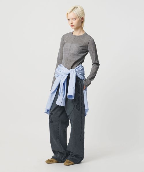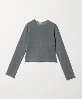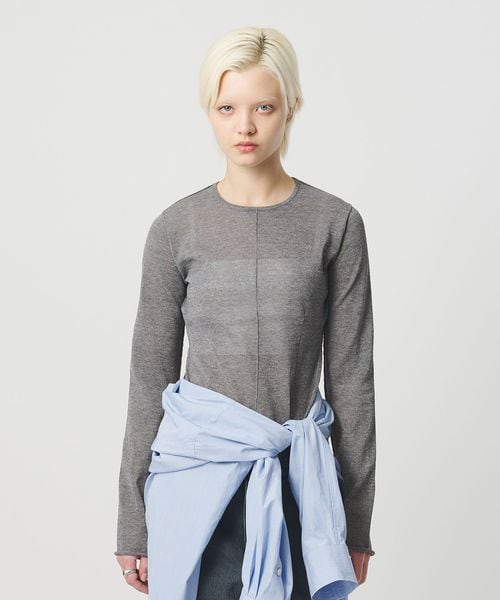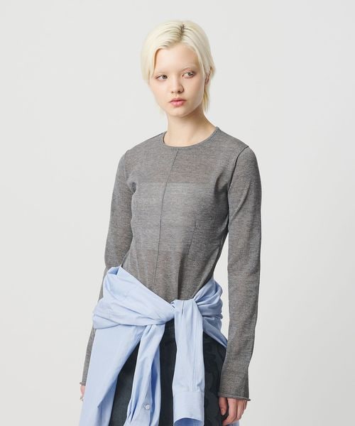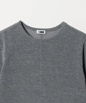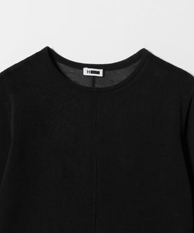 控えめなシェイプボディに、ストレートスリーブのバランスがポイントのニットプルオーバーです。さらりとした風合いで、ほどよい張りと透け感のあるポリエステル×コットン糸を使用しています。継ぎ目や中央の切替えをアウトシームで飾り付け、袖口をロールさせることでナチュラルなニュアンスを添えました。シンプルながら、視覚的なデザイン性が個性を生むさりげないスパイスに。ワイドパンツから定番のデニムまで、オーディナリーな着こなしもスタイリッシュなムードに導く万能な一着。