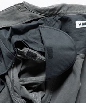 取り外し可能な肩パッドを備えた、パワーショルダー型のハーフブルゾンです。ハイツイストコットンのツイル生地を使用し、染料&顔料染色し製品加工をすることで、 ヴィンテージのような雰囲気に仕上げています。ウエスト内側にはドローストリングを配し、寒さ対策としての機能面に加え、絞ることで肩のラインを強調したアレンジも楽しめます。きれいめなトラウザーと合わせたモードな着こなしはもちろん、肩パッドを外してカジュアルに羽織るのもおすすめ。ラスティックな素材感とパワフルなディテールのバランスが、日常のスタイルにさりげないエッジをプラスします。