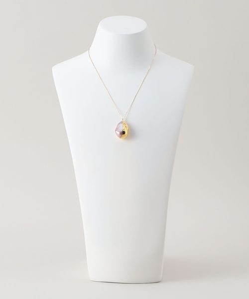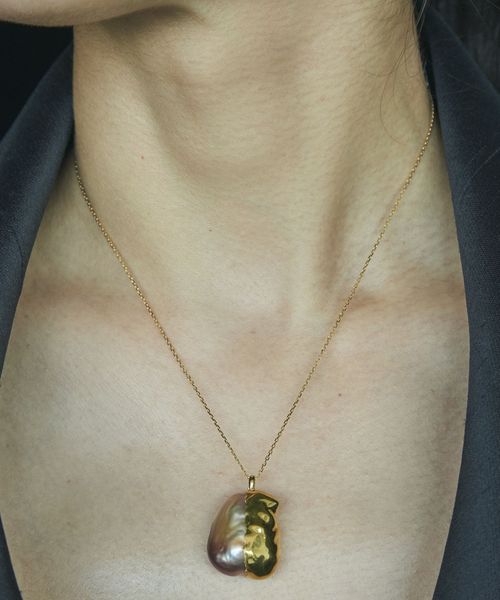 大きめなパールとK24メタルの曲線が女性らしさ際立たせるネックレスです。チェーンはK18YGカットオーバルチェーンを使用し、モチーフは、大粒なナチュラルオレンジの淡水パールに、K24YGの特殊加工PREEK Dip coatingをハーフサイドのみ施しています。エレガントな煌めきを纏った贅沢なボリュームが、個々のフェミニティを昇華する一品。やわらかなデザインは、日常使いからドレスアップシーンまで幅広く活躍いただけます。