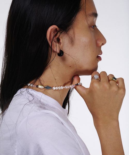 ファインジュエリー工房の職人たちとのコラボレーションによって、かたちの歪んだバロックパールや、宝石彫刻を扱う伝統工芸士が削り出した天然石など、主に有機的な素材を使用したジュエリー製作が特徴です。