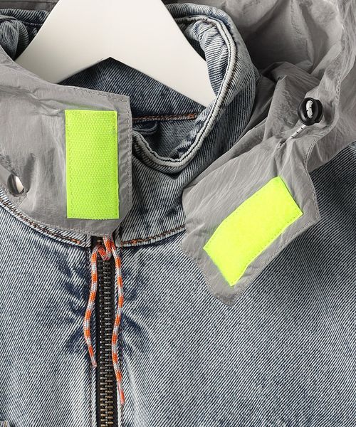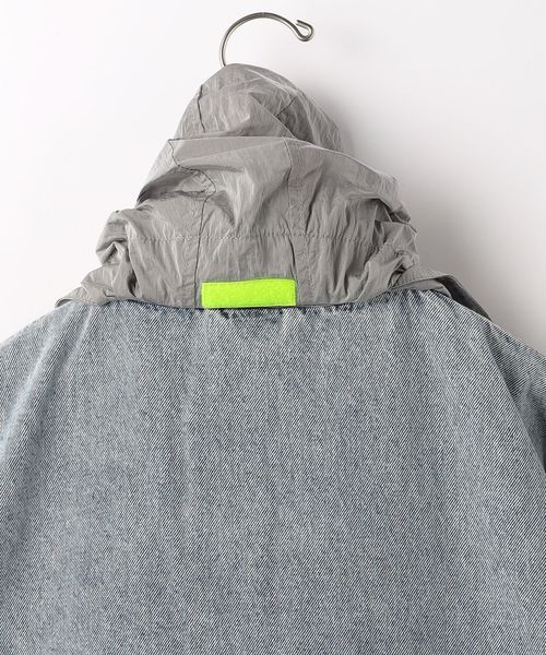 異素材で切り替えた着脱可能なフードや蛍光色の面ファスナーもアクセントになっています。