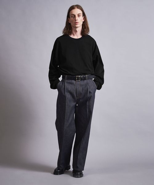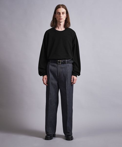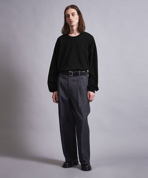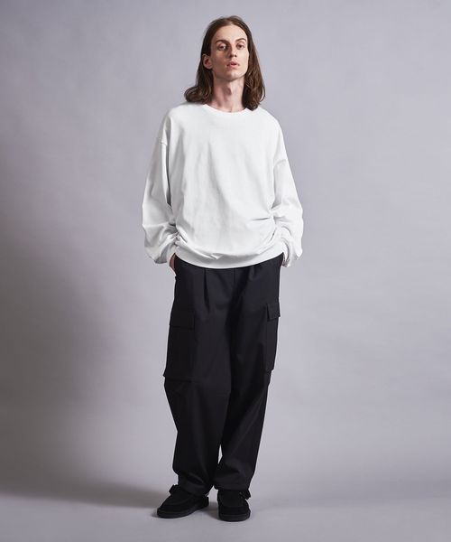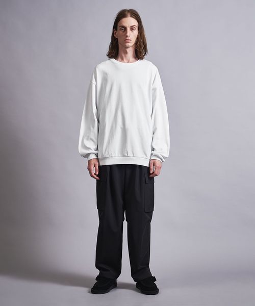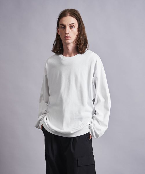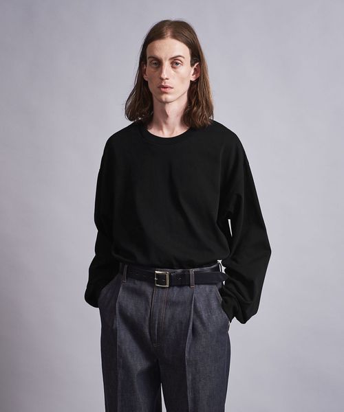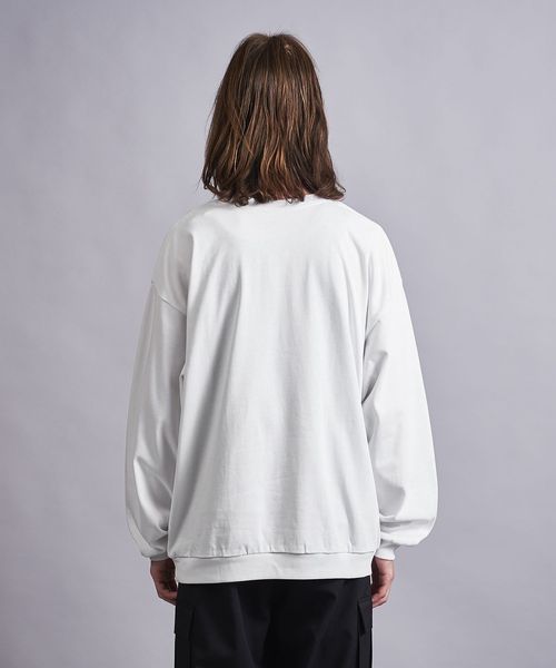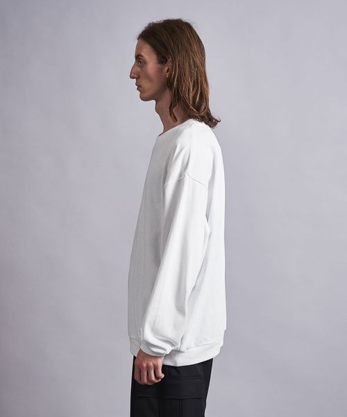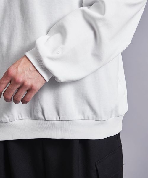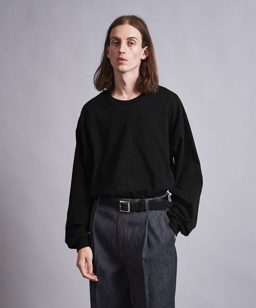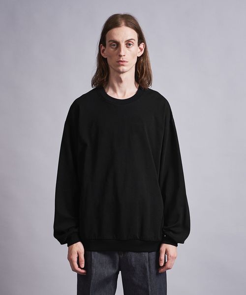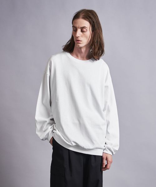 <VATANLOOP>のブランドロゴが袖に同色でさりげなく刺繍された裾リブ付きのスウェット型ロングスリーブカットソー。