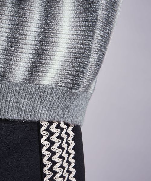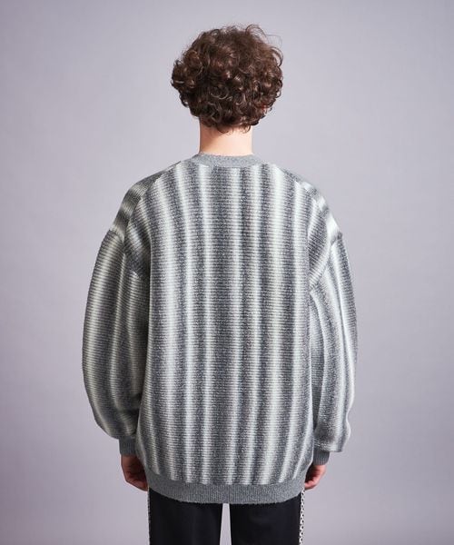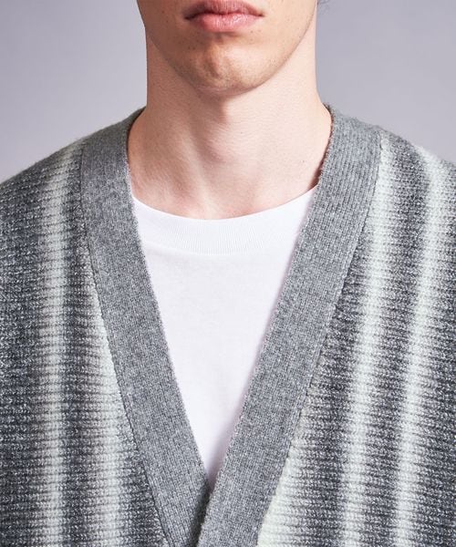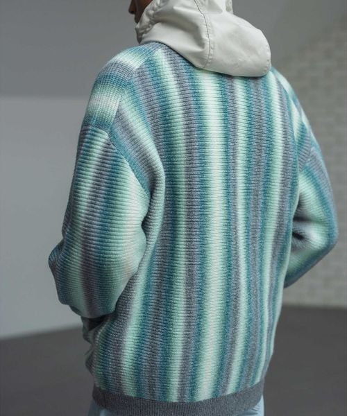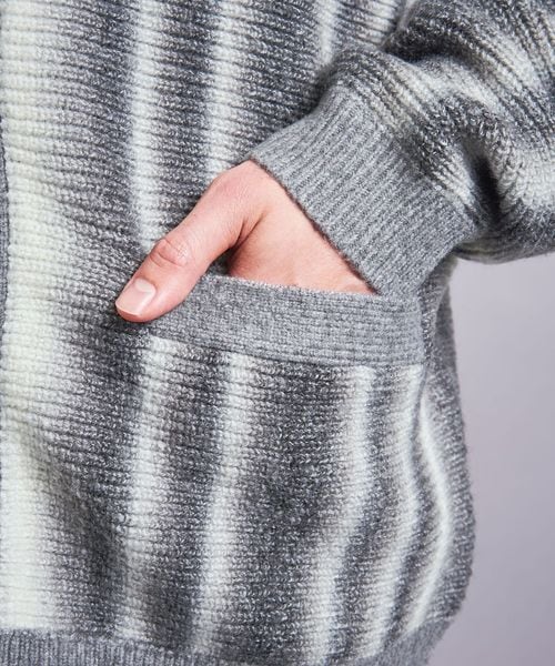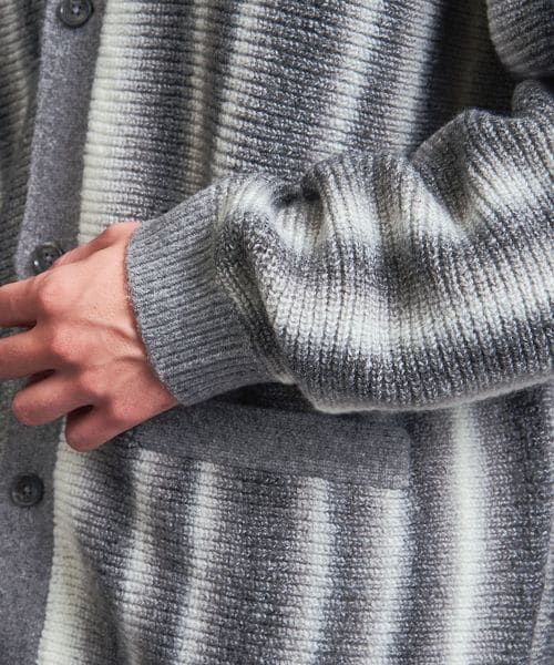 本来ボーダー状の編組織を畦編でタテ使いにする事でオンブレストライプを表現した一着です。