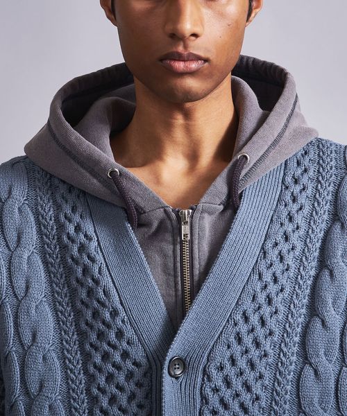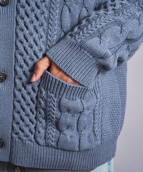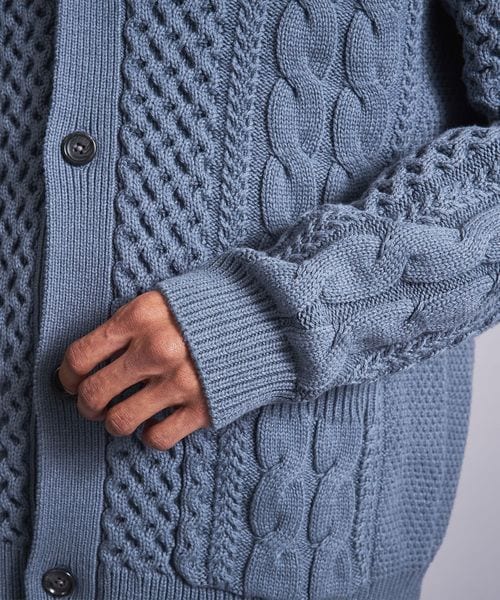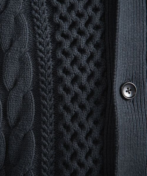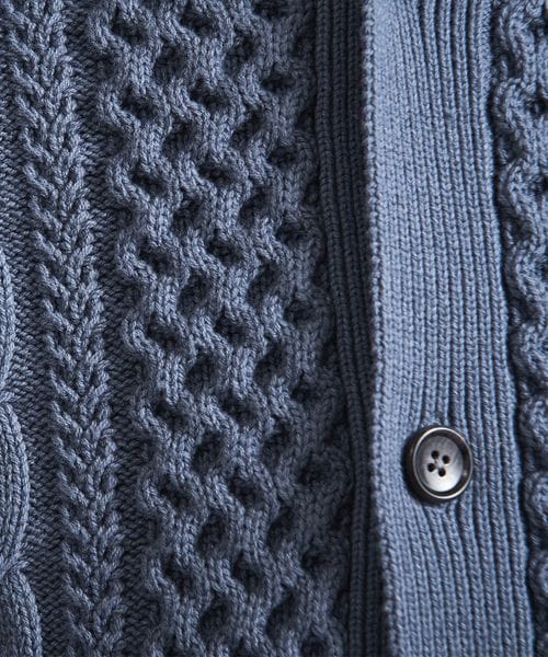 糸自体に膨らみのある綿アクリルの糸で編んだフィッシャーマンカーディガン。